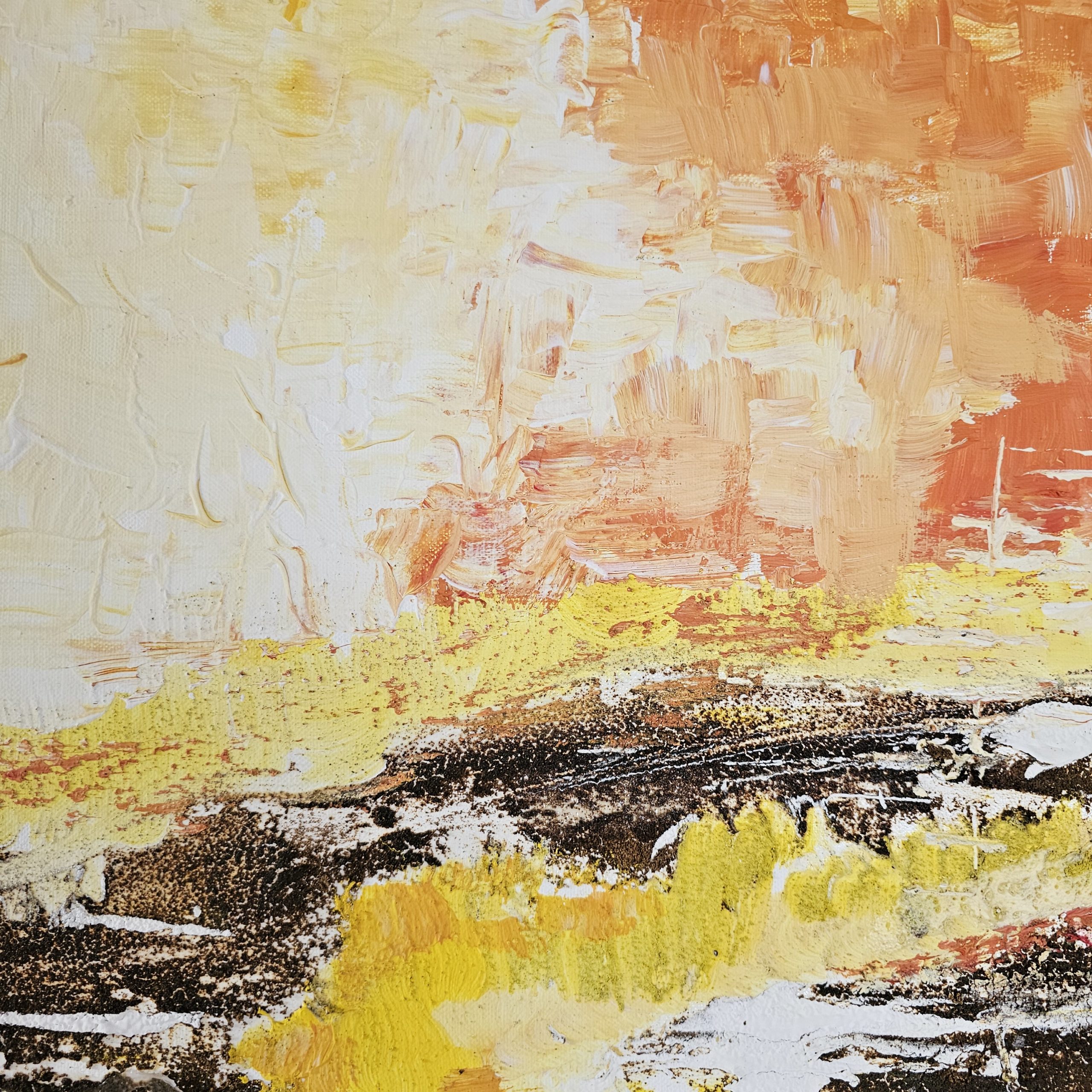 L’artiste peint ici un paysage contemporain. Dans ce lieu imaginaire, elle laisse aller sa touche de façon à la fois libre, structurée et vibrante. Elle se promène sur la toile et apporte du graphismes en matières. Ce tableau est vibrant et vivant.